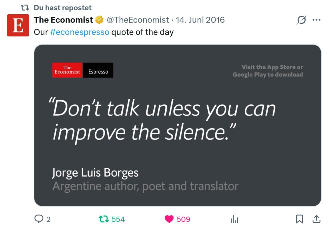 02. Februar 2026. Ich lösche nach fast 16 Jahren meinen Twitteraccount. Bye, bye, 1.101 Follower. Seit 2018 habe ich Twitter nicht mehr wirklich benutzt, sondern nur sporadisch die untenstehenden Zitate gepostet. Ergo ist es nur konsequent, jetzt ganz aufzuräumen. Ich vermisse: nichts.